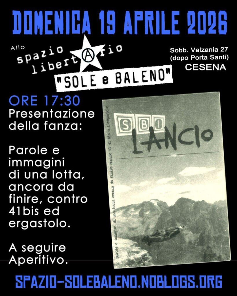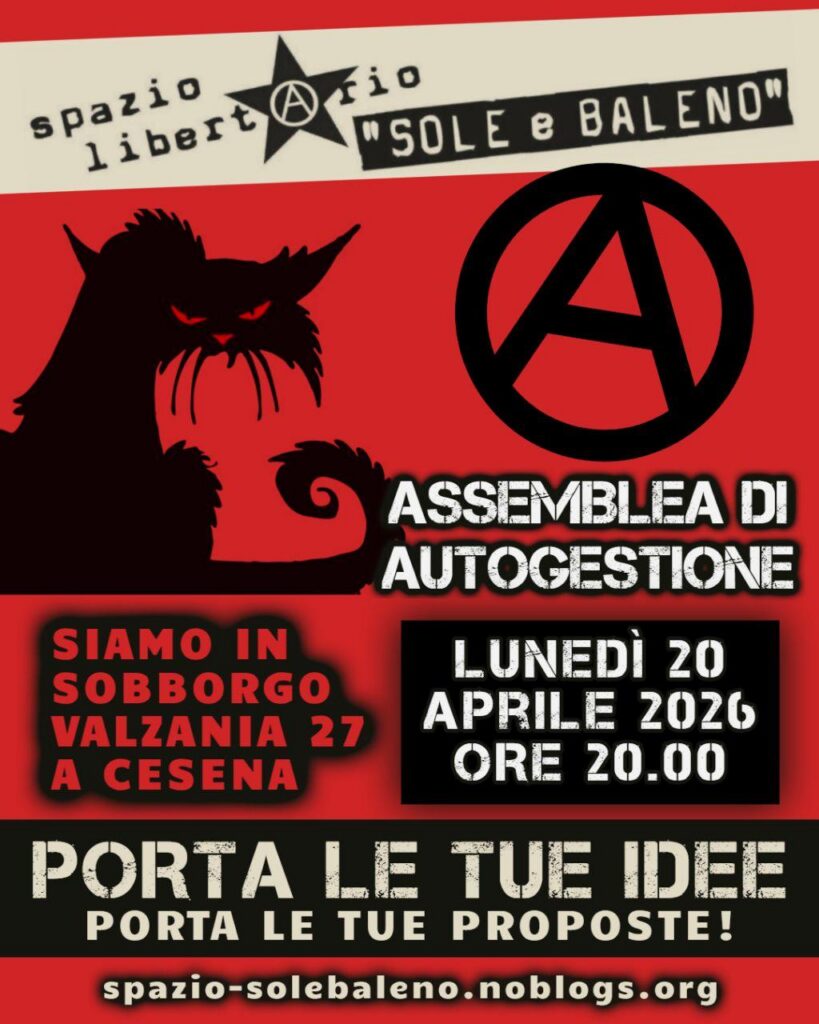 Nella giornata del 20 dicembre l’apertura consueta del sabato dello Spazio Libertario “Sole e Baleno” non ci sarà perché parteciperemo ad Assalto Sonoro, la Street Parade che si terrà a Cesena con concentramento alle ore 13.00 al parcheggio dell’Ippodromo.