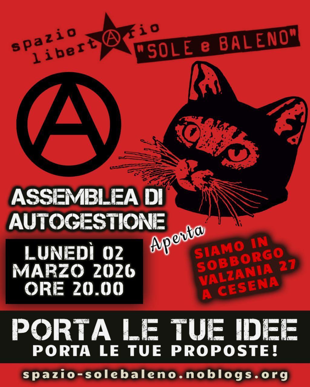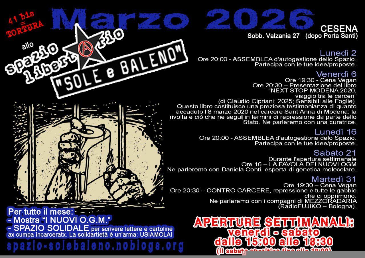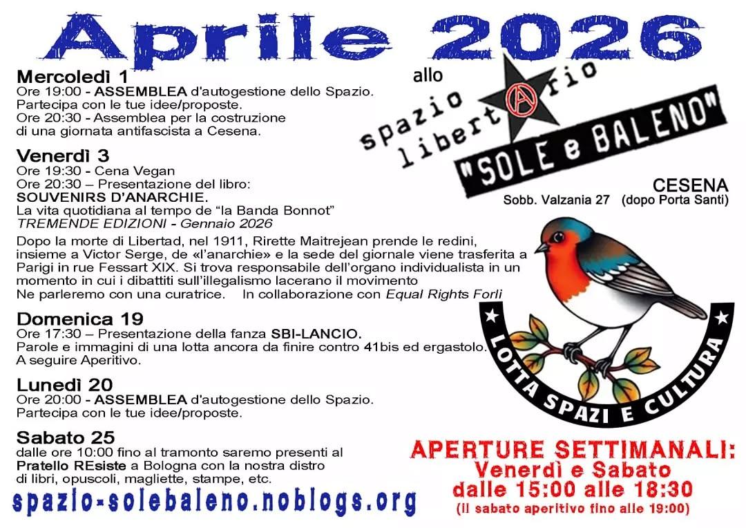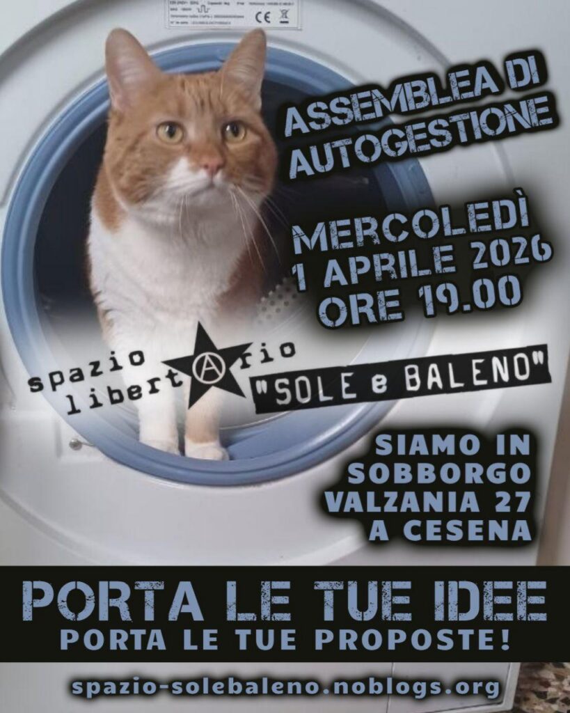 Nella giornata del 20 dicembre l’apertura consueta del sabato dello Spazio Libertario “Sole e Baleno” non ci sarà perché parteciperemo ad Assalto Sonoro, la Street Parade che si terrà a Cesena con concentramento alle ore 13.00 al parcheggio dell’Ippodromo.